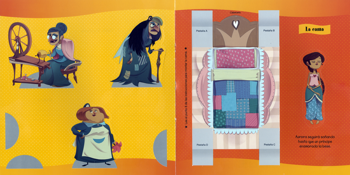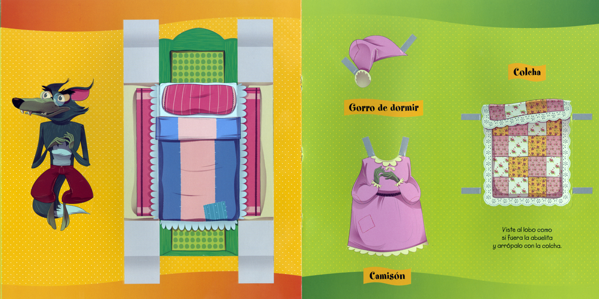 Encuadernación: Cartulina plastificada con estampación, interior con escenario, figuras precortadas y cuento